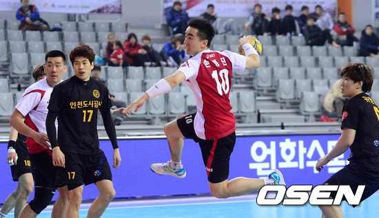 8일 오후 서울 방이동 SK핸드볼경기장에서 열린 '2013 SK 핸드볼 코리아리그' 남자부 상무피닉스와 인천도시공사의 경기 후반 상무 손병진이 슛을 시도하고 있다.