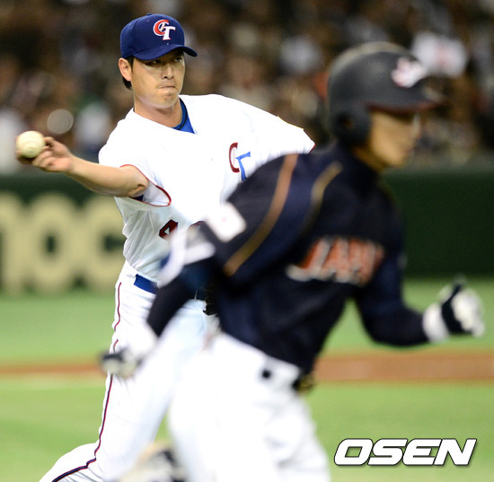 8일 오후 일본 도쿄돔에서 2013 월드베이스볼클래식(WBC) 2라운드 1조 일본과 대만의 경기, 3회초 무사 1루 왕젠밍이 타구를 잡아 1루로 던져 타자주자를 아웃시키고 있다.