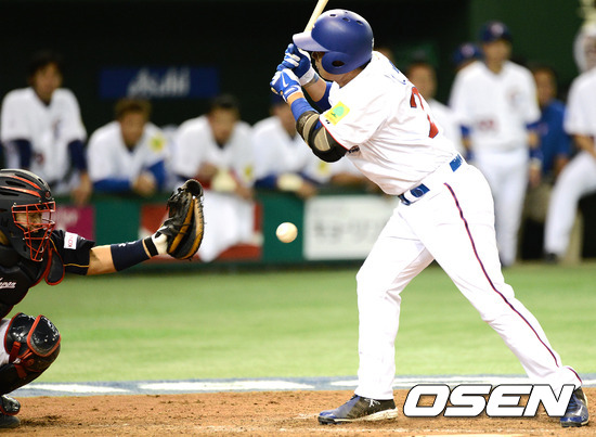 8일 오후 일본 도쿄돔에서 2013 월드베이스볼클래식(WBC) 2라운드 1조 일본과 대만의 경기, 3회말 1사 3루 펑정민이 투구에 맞고 있다.