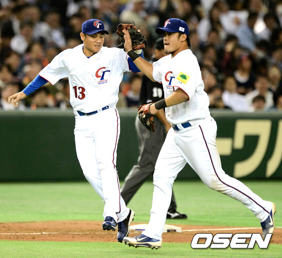 8일 오후 일본 도쿄돔에서 2013 월드베이스볼클래식(WBC) 2라운드 1조 일본과 대만의 경기, 4회초 2사 1,3루 나카타를 내야땅볼로 처리 위기를 넘긴 린즈성이 천융즈와 기쁨을 나누고 있다.