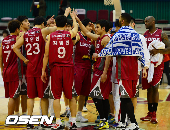 경기를 마치고 LG 선수들이 코트 위에서 하이파이브를 하고 있다. / rumi@osen.co.kr