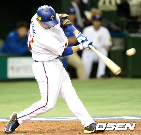 8일 오후 일본 도쿄돔에서 2013 월드베이스볼클래식(WBC) 2라운드 1조 일본과 대만의 경기, 5회말 1사 2루 펑정민이 적시타를 치고 있다.