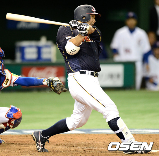 8일 오후 일본 도쿄돔에서 2013 월드베이스볼클래식(WBC) 2라운드 1조 일본과 대만의 경기, 8회초 무사 1,3루 아베가 적시타를 치고 있다.