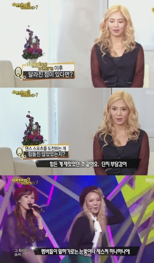 효연은 8일 오후 방송된 MBC 예능프로그램 ‘댄싱 위드 더 스타 3’에서 “지난 시즌이 끝난 후 달라진 점이 있다면, 9명의 멤버들 사이에서 파트가 많지는 않지만 책임감과 자신감을 얻었다”고 말했다.