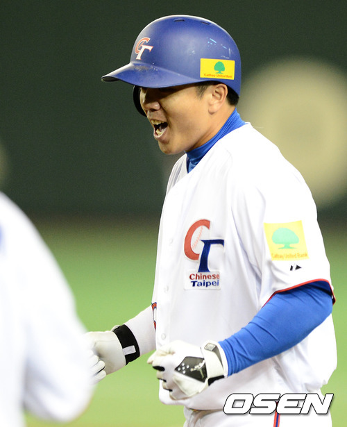 8일 오후 일본 도쿄돔에서 2013 월드베이스볼클래식(WBC) 2라운드 1조 일본과 대만의 경기, 8회말 무사 2,3루 저우쓰즈가 적시타를 치고 환호하고 있다.