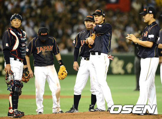 8일 오후 일본 도쿄돔에서 2013 월드베이스볼클래식(WBC) 2라운드 1조 일본과 대만의 경기, 8회말 무사 2,3루 조우쓰지에 점수를 내준 일본 선수들이 마운드에 모여 침울한 표정을 짓고 있다.