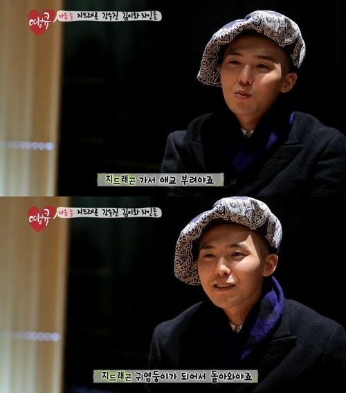 지드래곤은 8일 오후 방송된 SBS 예능프로그램 '땡큐’에서 공개된 예고편에 등장해 “가서 애교 부려야겠다”며 귀엽게 각오를 다졌다.