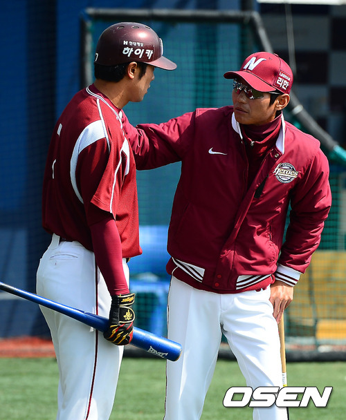 경기 전 넥센 염경엽 감독이 김민우와 타격폼에 대해 얘기를 나누고 있다.