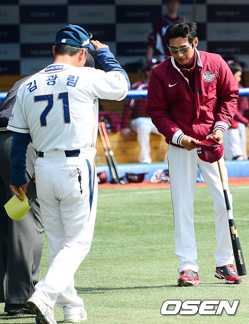 경기 전 NC 김광림 코치에게 넥센 염경엽 감독이 인사를 하고 있다.