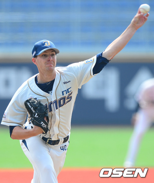 NC 선발 아담이 힘차게 공을 뿌리고 있다.