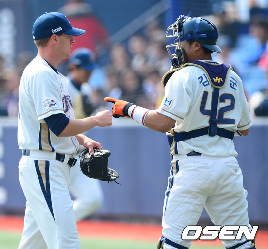 1회초를 막아낸 NC 선발 아담과 김태군 포수가 하이파이브를 하고 있다.