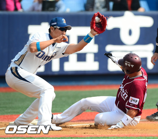 2회초 2사 주자 1루 박현도의 땅볼타구때 NC 3루수 모창민의 실책으로 1루 주자 오윤이 3루에 세이프되고 있다.