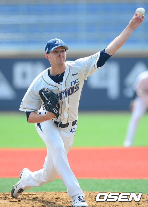 NC 선발 아담이 힘차게 공을 뿌리고 있다.