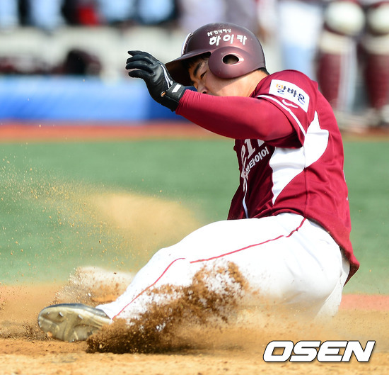 2회초 2사 주자 1,3루 넥센 박동원이 좌익수 왼쪽 선취 2타점 적시타때 1루 주자 박헌도가 홈으로 몸을 던지고 있다.