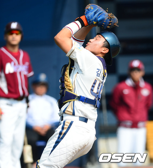 3회초 2사 주자 1루 넥센 김민성의 타구를 NC 김태군이 잡아내고 있다.