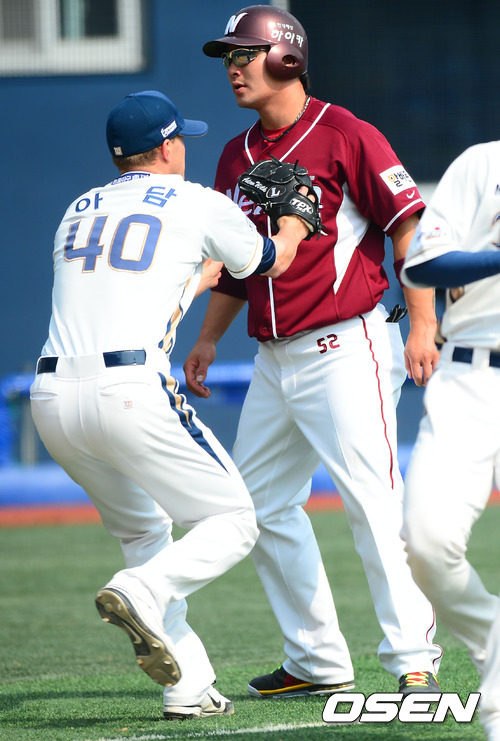 4회초 무사 주자 1,3루 넥센 오윤의 3루수 앞 땅볼때 3루 주자 박병호가 런다운에 걸리며 아담에게 태그아웃을 당하고 있다.