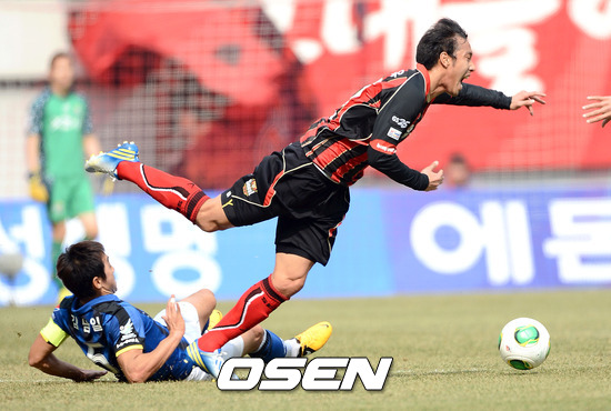 9일 오후 서울월드컵경기장에서 열린 '현대오일뱅크 K리그 클래식 2013' 2라운드 FC서울과 인천 유나이티드의 경기 전반 FC서울 한태유가 인천 김남일의 태클에 걸려 넘어지고 있다.