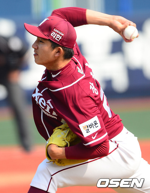 5회말 넥센 선발 벤헤켄 대신 마운드에 오른 장효훈이 힘차게 공을 뿌리고 있다.