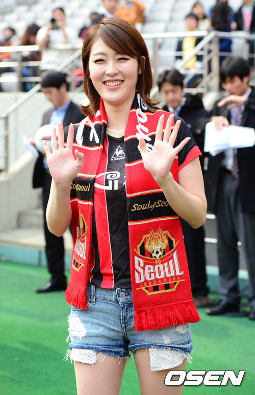 9일 오후 서울월드컵경기장에서 열린 '현대오일뱅크 K리그 클래식 2013' 2라운드 FC서울과 인천 유나이티드의 경기에 앞서 SBS ESPN 신아영 아나운서가 시축을 하기위해 그라운드로 나서고 있다.