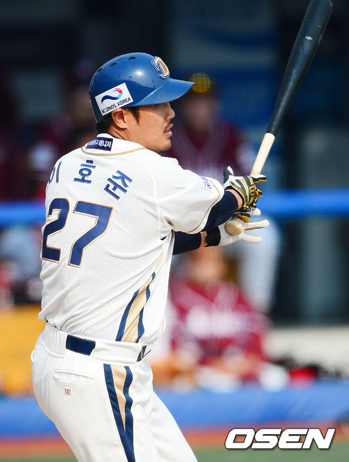 1사 주자 3루 NC 이호준이 중견수 앞 1타점 적시타를 날리고 있다.