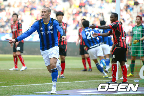 9일 오후 서울월드컵경기장에서 열린 '현대오일뱅크 K리그 클래식 2013' 2라운드 FC서울과 인천 유나이티드의 경기 후반 인천 디오고가 추가골을 넣고 기뻐하고 있다.