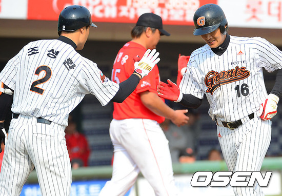 9일 부산 사직구장에서 열린 '2013 한국야쿠르트 세븐 프로야구' 롯데 자이언츠와 SK 와이번스의 시범경기 , 7회말 1사 2루 롯데 황재균의 선취 1타점 적시타때 2루 주자 박기혁이 선취 득점을 올린뒤 조성환과 하이파이브를 하고 있다