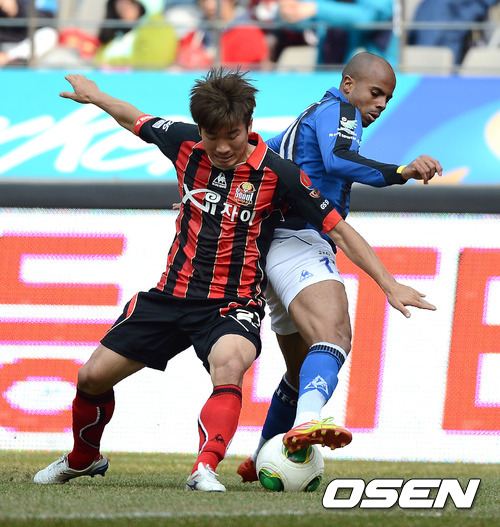 9일 오후 서울월드컵경기장에서 열린 '현대오일뱅크 K리그 클래식 2013' 2라운드 FC서울과 인천 유나이티드의 경기 후반 FC서울 고명진과 인천 찌아고가 볼 다툼을 벌이고 있다.