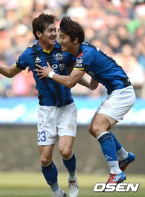 9일 오후 서울월드컵경기장에서 열린 '현대오일뱅크 K리그 클래식 2013' 2라운드 FC서울과 인천 유나이티드의 경기 후반 인천 문상윤이 추가골을 넣고 이석현과 기뻐하고 있다.