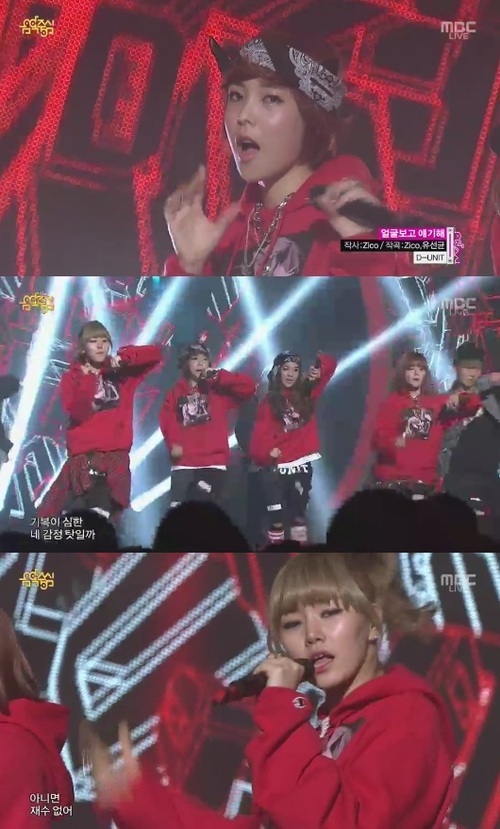 빨간색 후드티에 니삭스를 매치한 발랄한 느낌의 의상을 입고 무대에 오른 디유닛은 안정적인 가창력과 함께 깜찍한 안무로 실력을 뽐냈다.