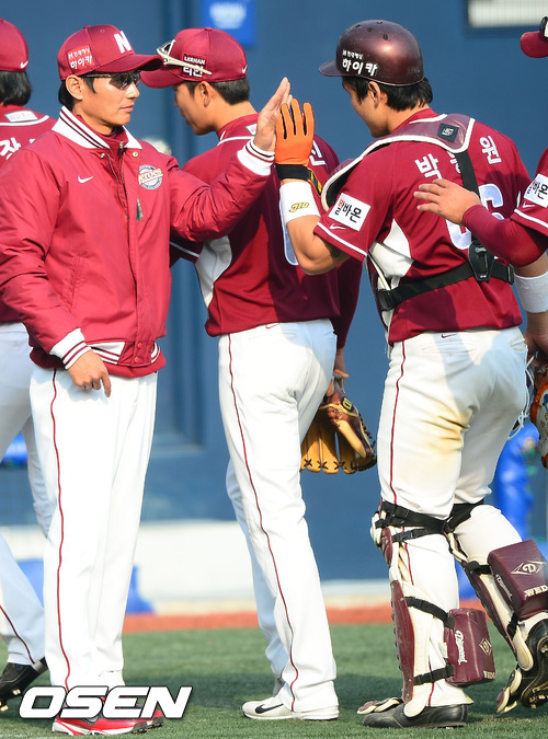 경기를 마치고 넥센 염경엽 감독이 박동원과 하이파이브를 하고 있다. / rumi@osen.co.kr