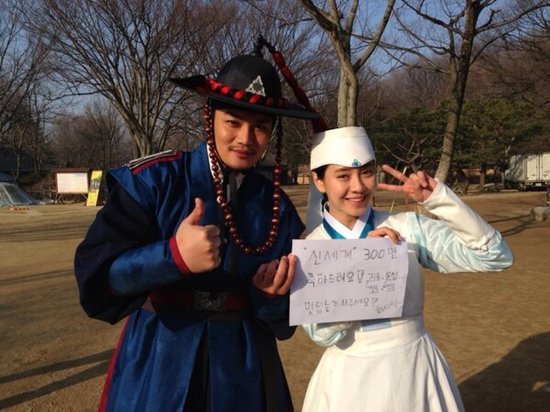 사진 속 김윤성과 송지효는 최근 촬영 중인 드라마의 의상을 입고 기쁜 표정으로 카메라 앞에 섰다. 특히 송지효는 ''신세계' 300만 축하드려요. 맛 있는 것 사드세요'라고 적힌 종이를 들고 기쁨을 표현하고 있어 눈길을 끈다.