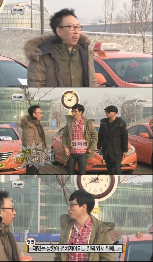 유재석이 지각한 후 일찍 와서 뭐 하느냐고 뻔뻔하게 대응했다.