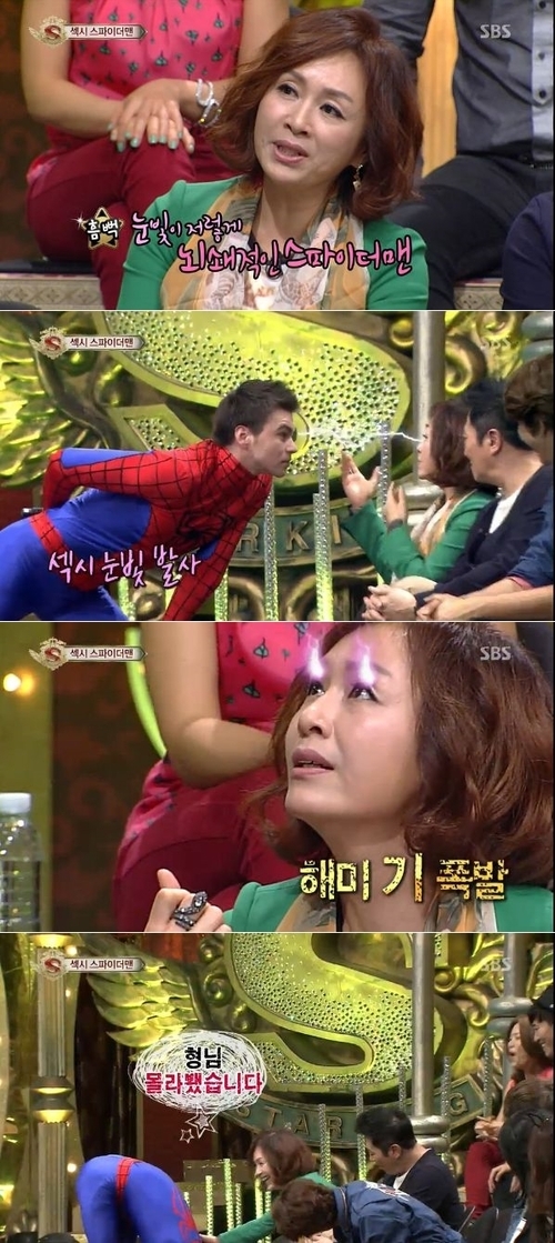'스타킹'의 패널 박해미가 뇌쇄적인 눈빛의 섹시 스파이더맨을 눈싸움으로 제압해 눈길을 끌었다.