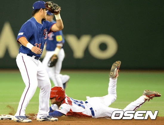 9일 오후 일본 도쿄돔에서 열린 '2013 월드베이스볼클래식(WBC)' 2라운드 1조 대만과 쿠바의 경기, 3회말 2사 1루에서 쿠바 페르난데스 타석 때 1루주자 구리엘이 도루에 성공하고 있다.