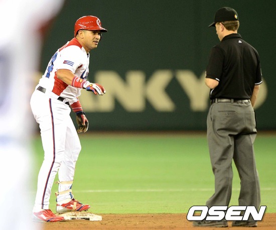 6회말 1사 2루 쿠바 세페다가 중전 적시타를 치고 2루에서 타임을 외치고 있다./sunday@osen.co.kr