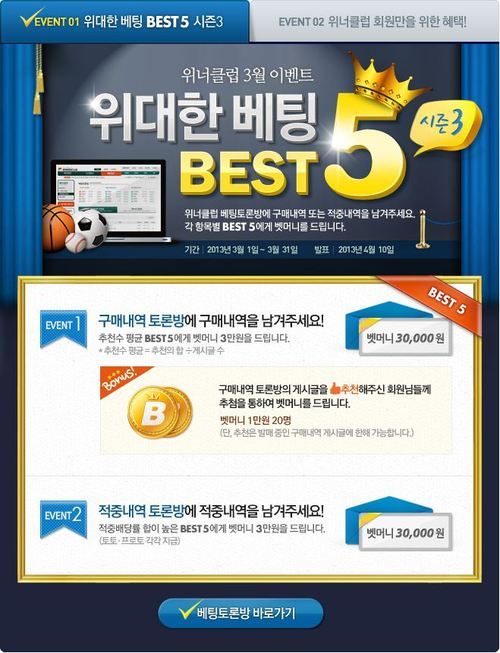 [스포츠토토] 국민체육진흥공단(www.kspo.or.kr)이 발행하는 국민체육진흥투표권 수탁사업자인 스포츠토토의 공식 온라인 발매사이트인 베트맨(www.betman.co.kr)이 위너클럽 3월 이벤트 '위대한 베팅 BEST5 시즌3'가 이벤트 개시 10여일 만에 조회수 5000건(10일 오전 9시 기준 5,792건)을 돌파하는 등 토토팬들의 뜨거운 호응을 얻고 있다.