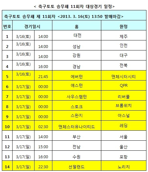 한편 이번 축구토토 승무패 11회차 게임은 오는 첫번째 경기 시작 10분전인 16일 오후 1시 50분까지 게임에 참여할 수 있다.