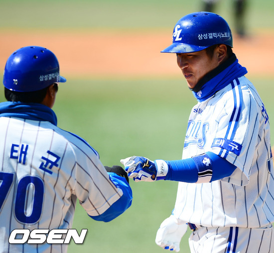 1회말 2사 주자 3루 삼성 최형우가 우익수 오른쪽 1타점 선취 적시타를 날린 후 1루에서 김태균 코치와 하이파이브를 하고 있다.