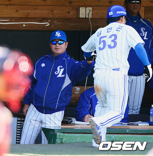 1회말 2사 주자 3루 삼성 최형우의 우익수 오른쪽 1타점 선취 적시타때 홈을 밟은 김현곤이 덕아웃에서 류중일 감독과 하이파이브를 하고 있다.
