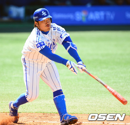 1회말 2사 주자 3루 삼성 박석민이 중견수 앞 1타점 적시타를 날리고 있다.