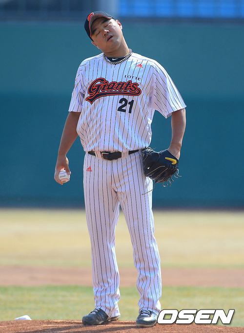 10일 부산 사직구장에서 열린 '2013 한국야쿠르트 세븐 프로야구' 롯데 자이언츠와 SK 와이번스의 시범경기 , 1회초 롯데 선발투수 송승준이 몸을 풀고 있다