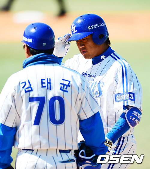 1회말 2사 주자 3루 삼성 박석민이 중견수 앞 1타점 적시타를 날린 후 1루에서 김태균 코치와 하이파이브를 하고 있다.