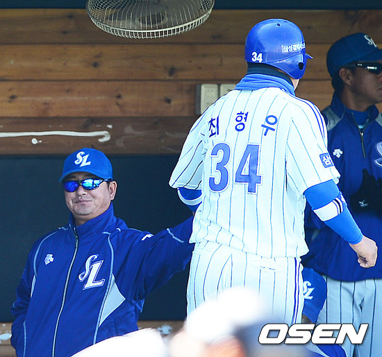 1회말 2사 주자 3루 삼성 박석민의 중견수 앞 1타점 적시타때 홈을 밟은 최형우가 덕아웃에서 류중일 감독과 하이파이브를 하고 있다.