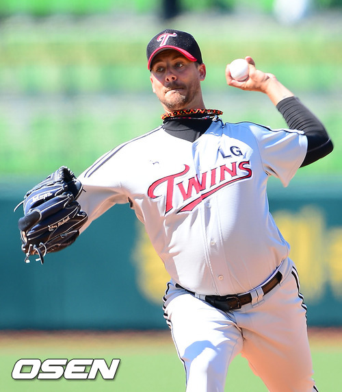 LG 선발 주키치가 힘차게 공을 뿌리고 있다.