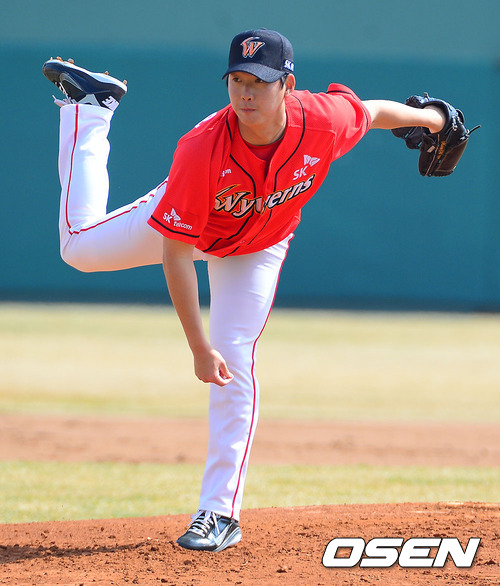 10일 부산 사직구장에서 열린 '2013 한국야쿠르트 세븐 프로야구' 롯데 자이언츠와 SK 와이번스의 시범경기 , 1회말 SK 선발투수 문승원이 역투하고 있다