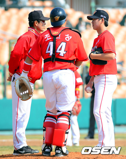 10일 부산 사직구장에서 열린 '2013 한국야쿠르트 세븐 프로야구' 롯데 자이언츠와 SK 와이번스의 시범경기 , 2회말 SK 성준 코치가 마운드에서 문승원 투수와 이야기를 나누고 있다
