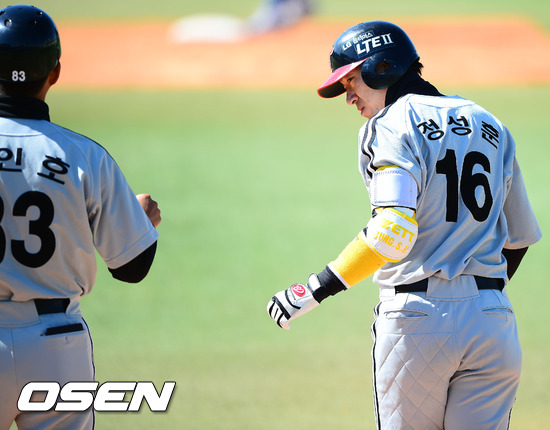 3회초 2사 주자 만루 정성훈이 좌중간 2타점 적시타를 날린 후 1루에서 김인호 코치와 하이파이브를 하고 있다.
