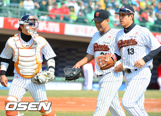 10일 부산 사직구장에서 열린 '2013 한국야쿠르트 세븐 프로야구' 롯데 자이언츠와 SK 와이번스의 시범경기 , 3회초 SK 공격을 막은 롯데 선발투수 송승준이 미소 지으며 더그아웃으로 들어가고 있다.