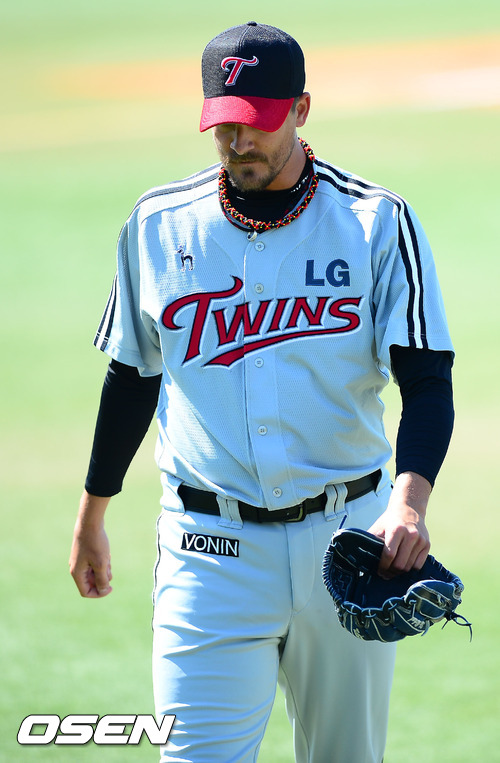 2회말 1사 주자 2,3루 삼성 김현곤 타석에서 LG 선발 주키치가 와일드피칭으로 2실점 한 후 2회말을 마치고 덕아웃으로 향하며 고개를 숙이고 있다.