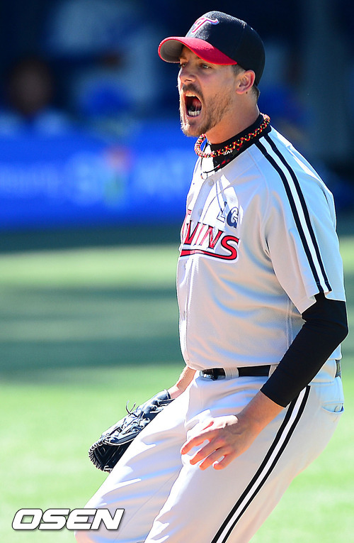 2회말 1사 주자 2,3루 삼성 김현곤 타석에서 LG 선발 주키치가 와일드피칭으로 주자가 모두 들어오자 주키치가 당황하고 있다.